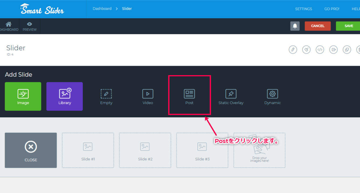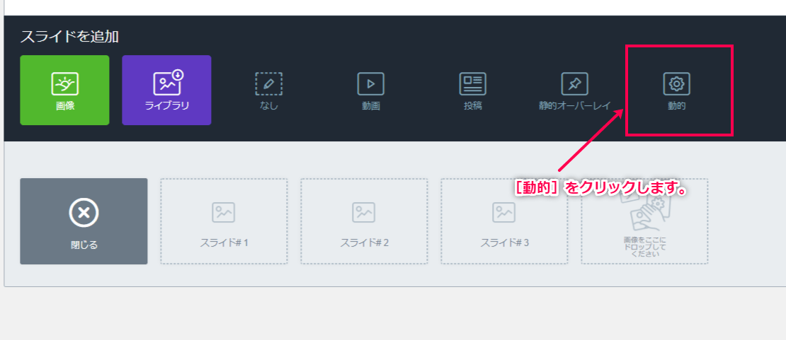 - サイドメニューの[Smart Slider] > [ダッシュボード] > [新しいスライダー] > [スライドを追加] > [動的]から設定画面にアクセスします。