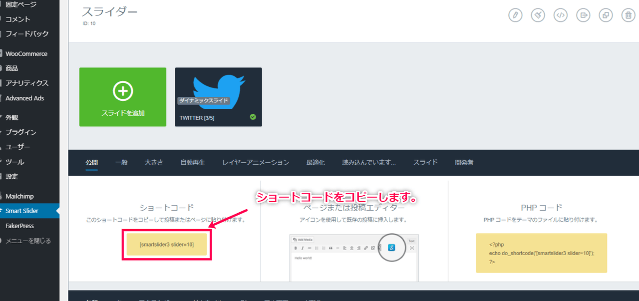 設定画面内にあるショートコードをコピーします。