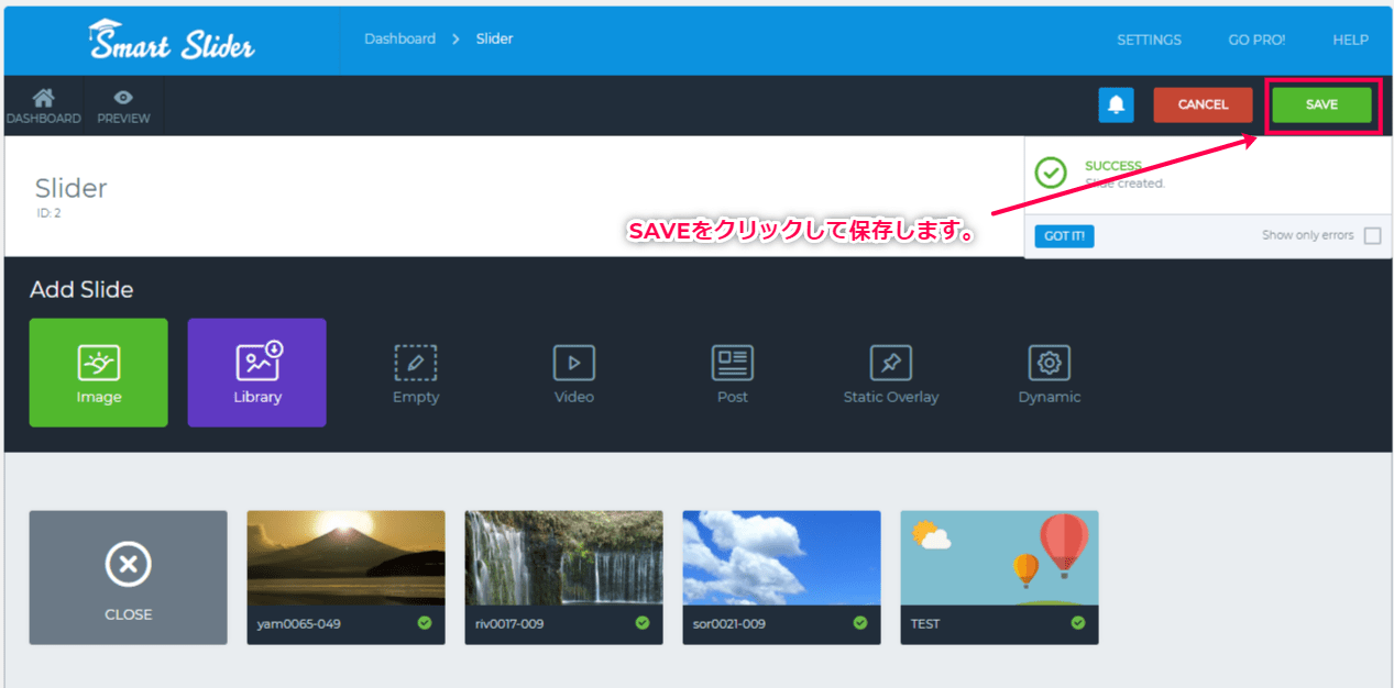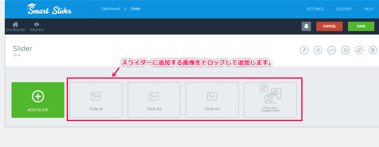 スライダーに使用する画像をドロップして追加します。 - 保存します。