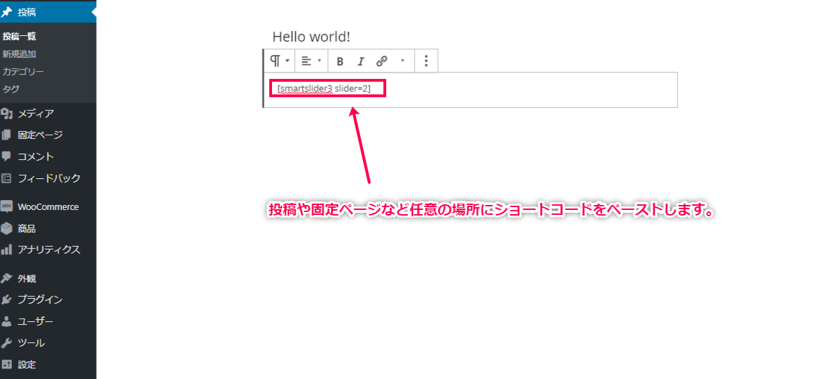 - 作成されたショートコードを任意の記事や、固定ページに貼り付けます。