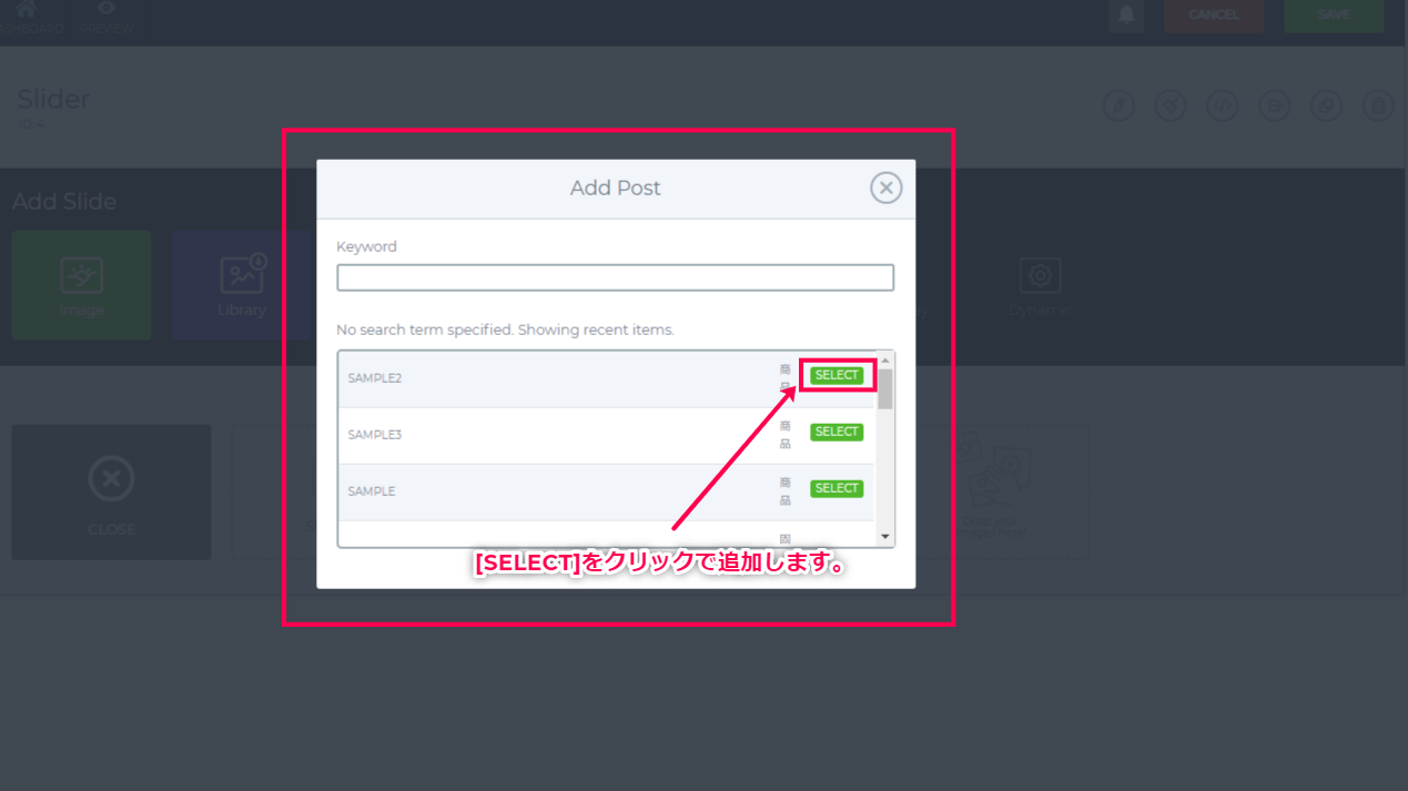 - 記事追加メニューが表示されたら、追加したい記事を選択して[SELECT]をクリックして追加完了です。