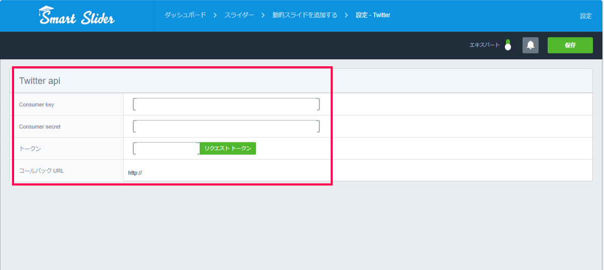 - [Consumer key]と[Consumer secret]、この二つを取得して入力します。