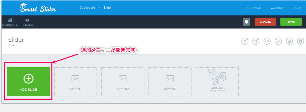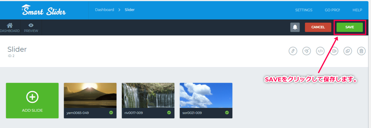 - サイドメニューの[Smart Slider] > [ダッシュボード] > [作成したスライダー]からスライダーの設定画面にアクセスします。