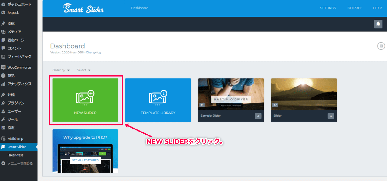 サイドメニューの[Smart Slider] > [NEW SLIDER]から作成画面にアクセスします。