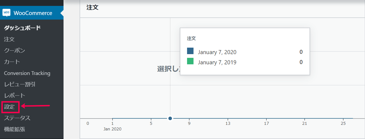 - 左メニューより [WooCommerce] > [設定] をクリック