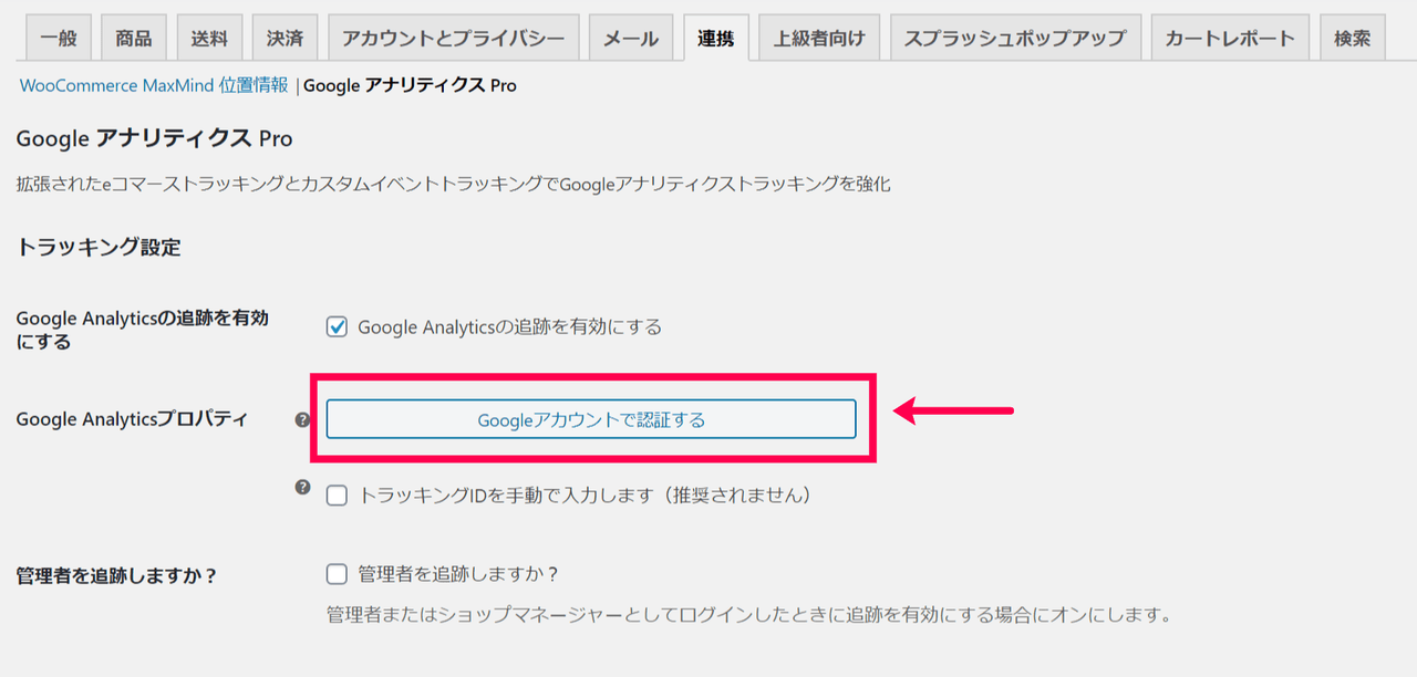- [連携] タブのGoogleアナリティクスプロパティから [Googleアカウントで認証する] をクリック