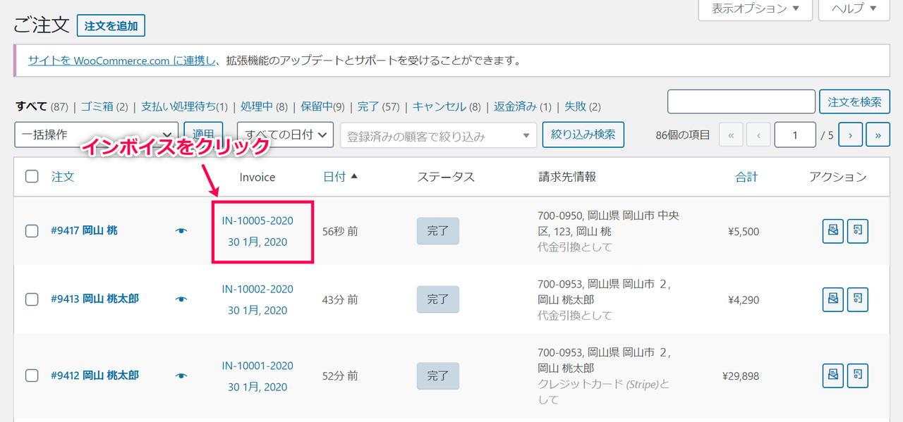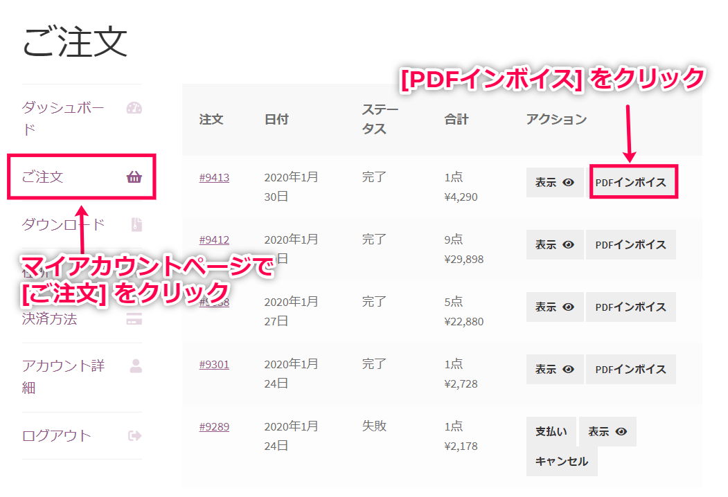 顧客は、マイアカウントページの注文一覧ページからインボイスを確認できます。