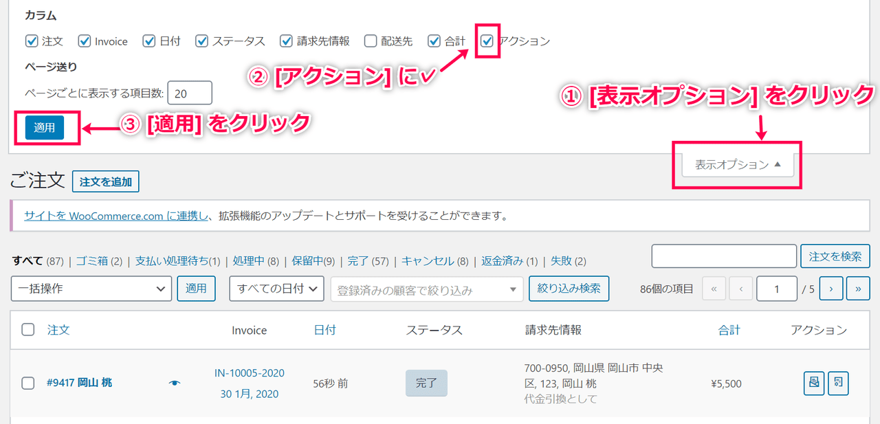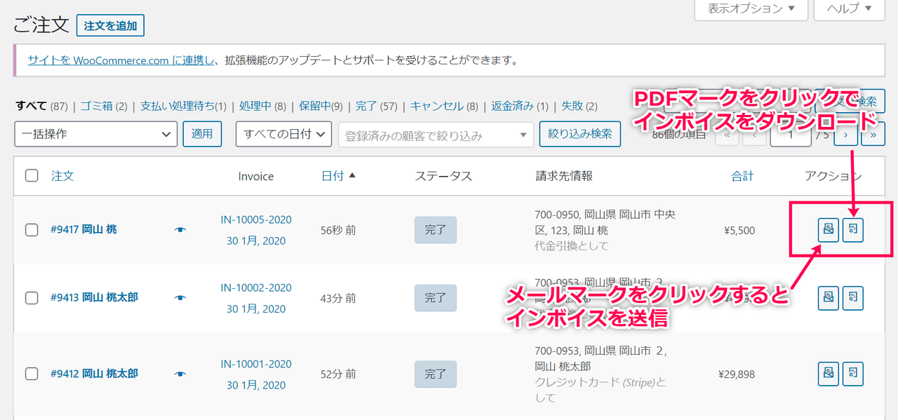 該当する注文の [アクション] 項目に [PDFインボイス] が追加されているのでクリックします。
