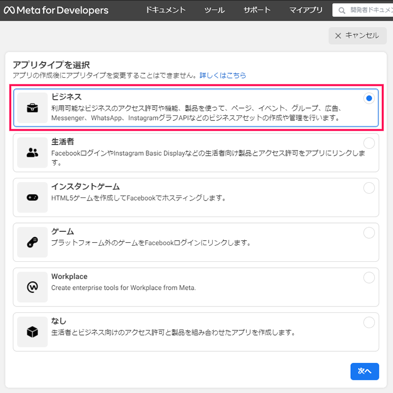 - 表示された[アプリタイプを選択] 画面で [ビジネス] を選択して [次へ] をクリックします。