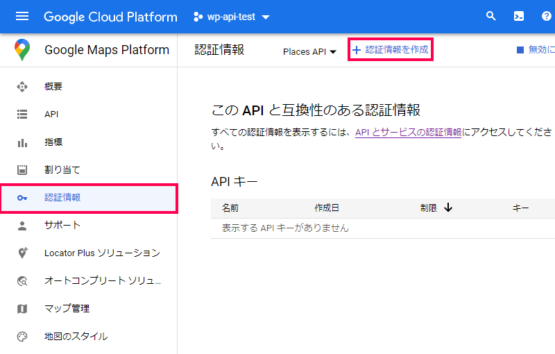 - [認証情報] タブをクリックして表示された[認証情報] 画面で [認証情報を作成] リンクをクリックします。