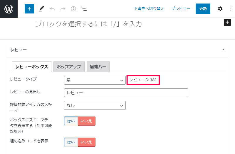 プラグインを導入後、投稿や固定ページに追加される [レビュー] ブロックを使って、表示されるレビューに関する設定を行います。